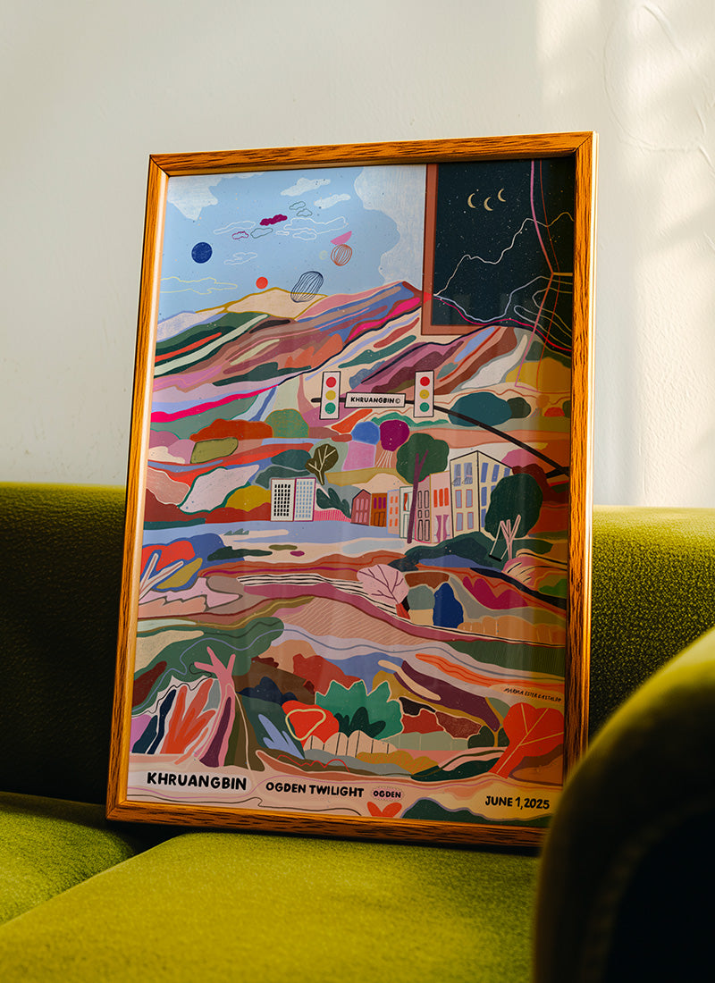 This limited edition poster celebrates Khruangbin’s ‘A La Sala’ tour at Ogden, translating the band’s soulful sound into a vibrant and evocative visual story. A striking piece for collectors and admirers of music and art alike.